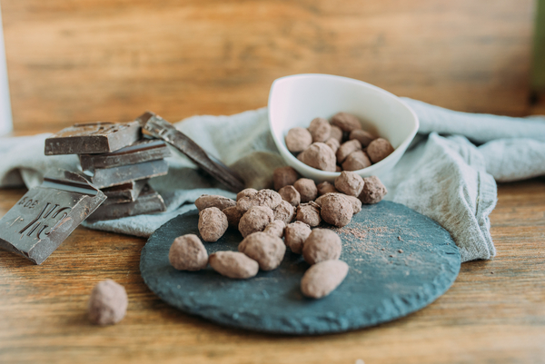 Zutaten: BIO-Mandeln, Zartbitterkuvertüre (Kakaomasse 60%, Zucker, Kakaobutter, Sojalecithin, natürliches Vanillearoma), Kakao, Puderzucker