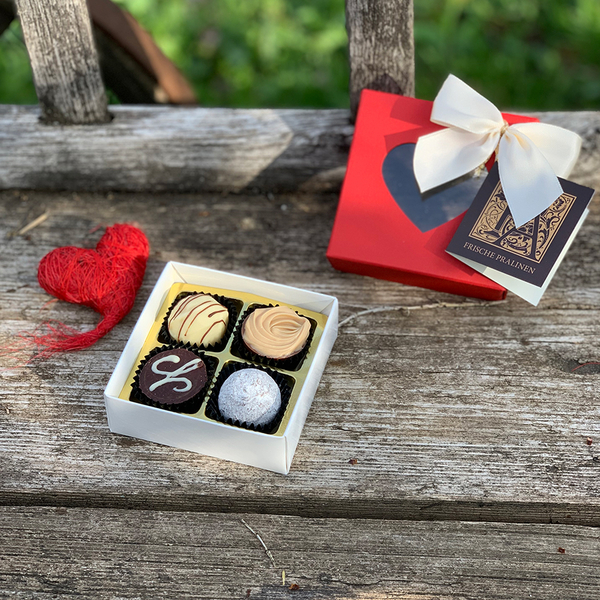 Hübsche Pralinenverpackung mit feinsten, handgefertigten Pralinen gefüllt. 45g.
