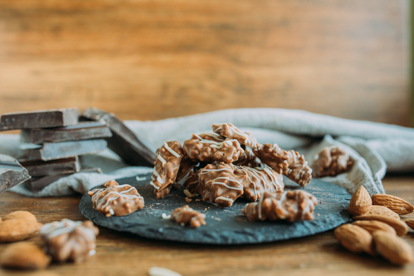 Zutaten: Mandelnougat (Mandeln 50%, Zucker, Kakaobutter, Sojalecithin, Salz), Mandeln, Zartbitterkuvertüre (Kakaomasse 60%, Zucker, Kakaobutter, Sojalecithin, natürliches Vanillearoma). Kann Spuren von anderen Schalenfrüchten und Gluten enthalten.